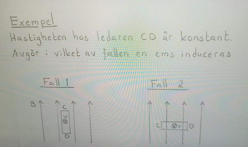 I andra fallet induceras det en spänning mellan C och D endast i Fall 2, dvs då sträckan CD rör sig vinkelrätt mot magnetfältet. I Fall 1 så rör sig ju sträckan CD parallellt med magnetfältet.