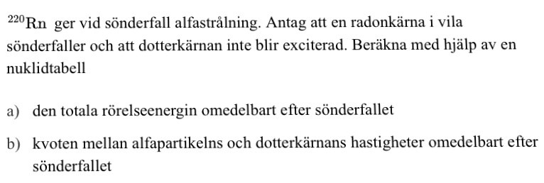 Jag har löst a) men jag är osäker på b). Jag hittade en formel på Wikipedia om kinetiska energin hos alfapartikeln där jag antar att mTh står för dotterkärnans massa och Q är elektronens laddning?