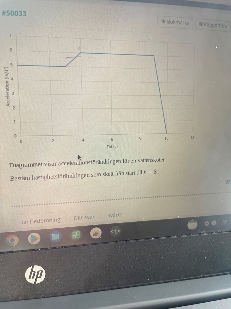 det jag tänkte var att räkna arean under grafen och då fick jag 44,5 m. Och sedan för att räkna hastigheten använde jag mig av formeln v=s/t och jag fick då 5,56 m/s.