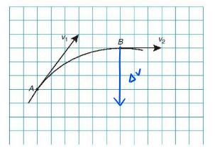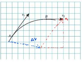 Hastighetsändringen Δv = v2-v1. Vektorn v2 är 3 rutor åt höger. Vektorn -v1 är 4 rutor ner och 3 rutor åt vänster. Vektorn Δv = v2-v1 = 4 rutor ner.