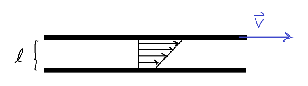 Jag försöker härleda ett explicit uttryck för hastighetsprofilen i en fluid som strömmar laminärt mellan två parallella plattor där strömningen induceras genom att den övre plattan rör sig med en hastighet och den undre plattan är orörlig. Koordinatsystemet är lagt så att positiv -riktning är rakt upp i bilden, positiv -riktning är in i bilden och positiv -riktning är rakt åt höger.