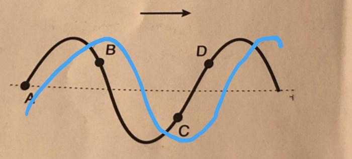 Alla punkter (dvs repet) rör sig antingen uppåt eller neråt, men själva vågen rör sig åt höger.