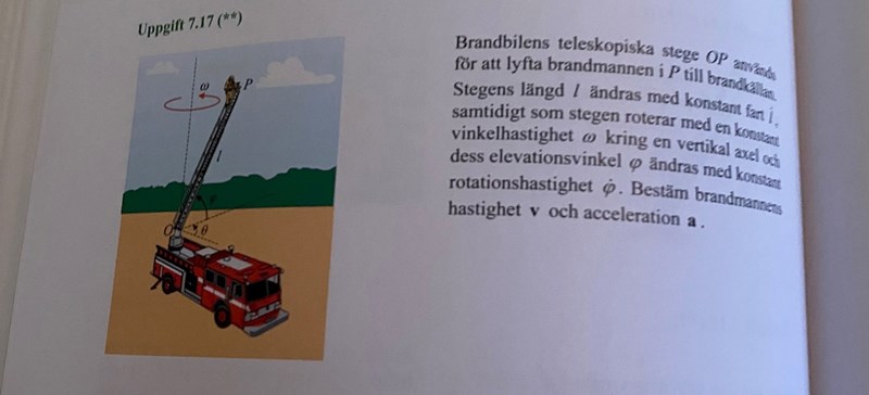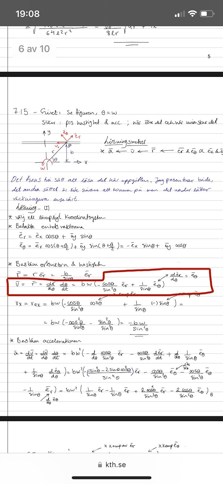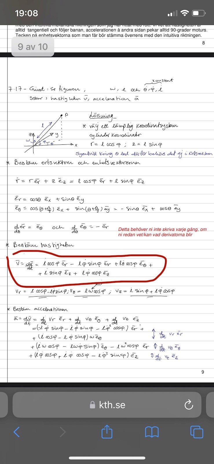 På 7.15 tar de dr/dt = dr/dø * dø/dt. Och när de tar tex derivatan av cos(ø) så blir det bara (-sin(ø)) och inte (-ȯ sin(ø)), alltså de räknar inte med att ø också beror på t, eller det gör de ju senare när de tar dø/dt.