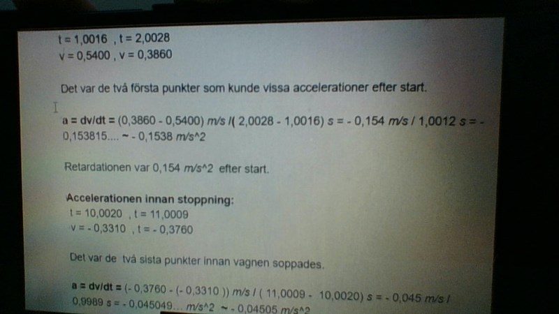 Jag räknade acceleration utifrån tabellen som jag fått när jag skulle räkna hastigheten vid de läge som krävdes av mig. Nu vet jag inte om jag räknade det rätt eller inte .