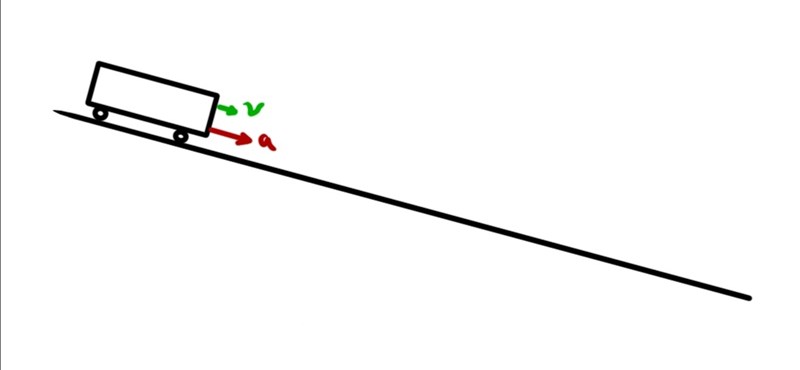 Accelerationen bestämmer du från tyngdkraftens komponent längs med planet. Rita en figur på vilka krafter som verkar på vagnen.
