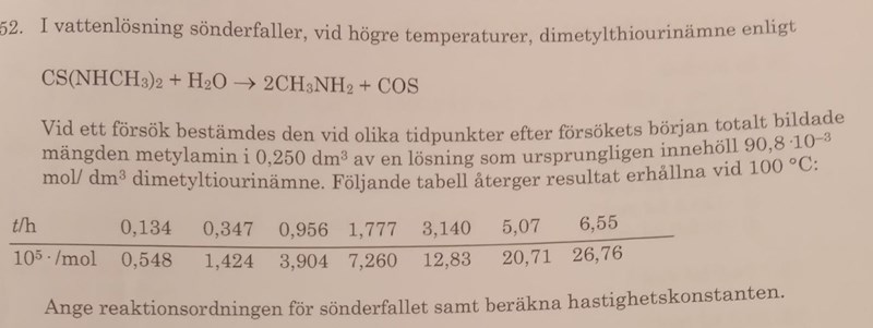 Jag hade börjat med att göra en ny tabell som visar koncentrationen av dimetyltiourinämne vid samma tidpunkter. Eftersom det är ett ämne som reagerar med vatten (som vi kan förmoda är i överskott) är det rimligt att anta att det handlar om första ordningens kinetik. Det man då kan göra är att linjärisera datat i tabellen och kolla om datapunkterna ligger längs en rät linje ifall man antar att det är en reaktion av första ordningen.