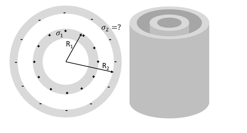 Given the following scenario, why is the charge per unit area not the same with opposite sign? I am finding it difficult to understand, since the charge per unit area for two parallel plates in a capacitor are related in this manner. How would the two relate in a cylindrical coaxial capacitor?