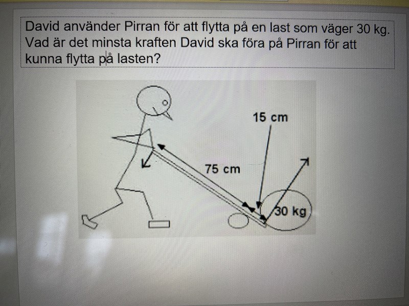 fner skrev:Har du sett uttrycket för kraftmoment tidigare? Där M är kraftmomentet, F är kraften och l är "armens" längd?