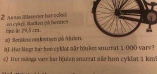 b) Om ett hjul snurrar tusen varv så har cykeln gått 590*pi meter som man kan räkna ut (fast min mobil är på laddning).