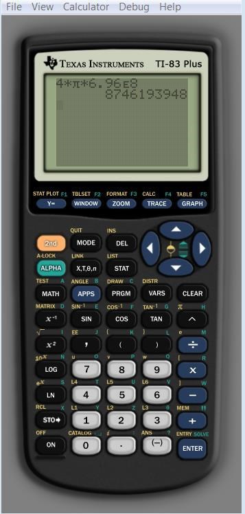 Jag har en texas instruments räknare TI-83 jag skrev in 4*pi*6,96*E^8