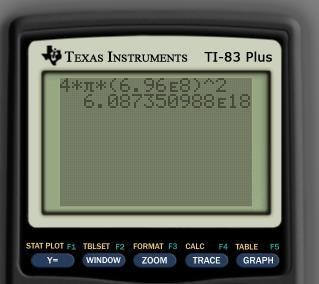 jag får 87461939948 vilket är fel jag ska kunna få 106,087*10^18 men får inte det jag har slagit 4*pi*6,96*E^8
