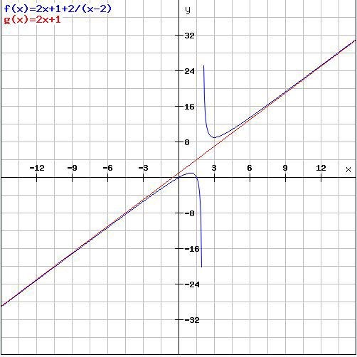 Eftersom f(x) mer och mer närmar sig 2x + 1 då x går mot plus oändligheten, dock utan att nå eller passera 2x + 1 (eftersom termen 2/(x-2) alltid är positiv och större än noll), så är 2x + 1 är en asymptot till f(x) då x går mot plus oändligheten.