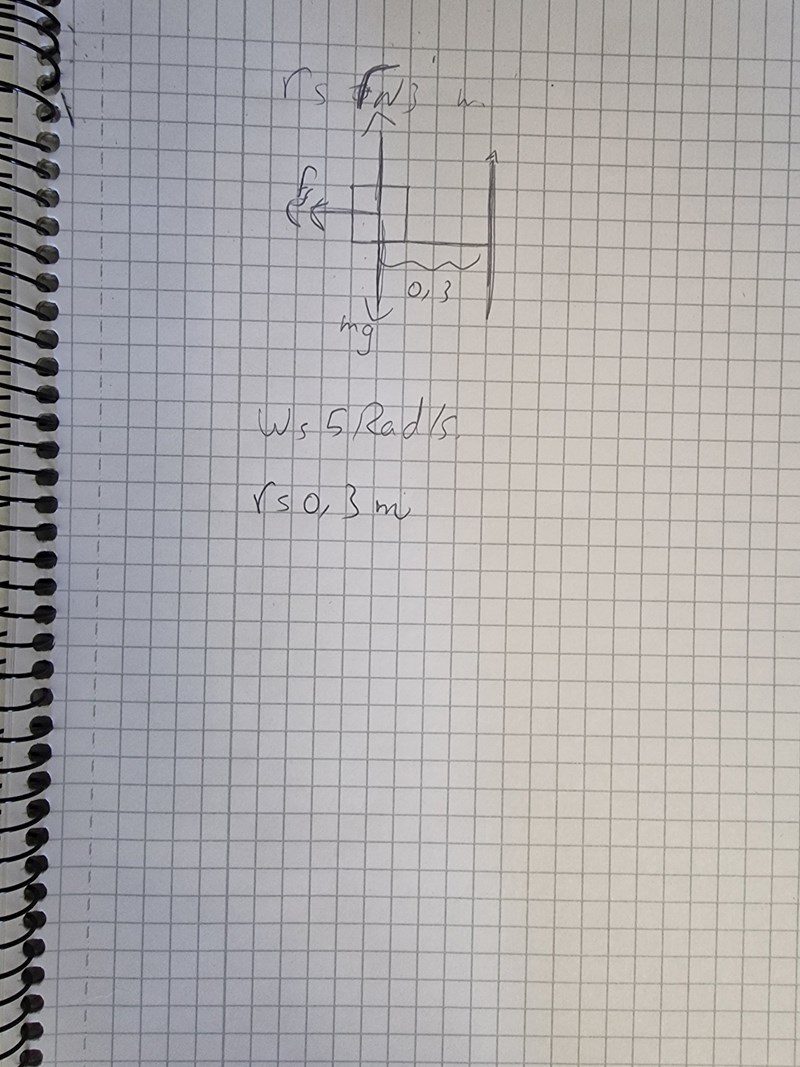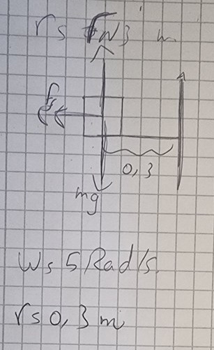 Ett föremål ligger på en roterande skiva på avståndet r = 0,3 m från rotationsaxeln som går genom skivans mittpunkt. Rita en figur som visar samtliga krafter som verkar på föremålet, och bestäm friktionskoefficienten μ om föremålet ligger kvar så länge vinkelhastigheten är mindre än 5 rad/s.