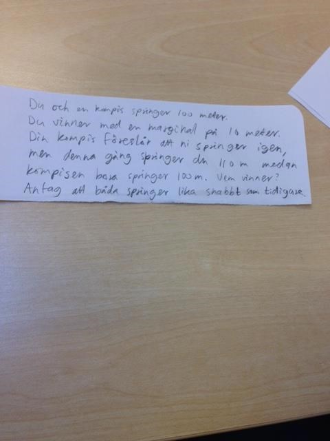 Hur lång tid tar det för dig att springa 110 m? Hur långt har kompisen hunnit på så många sekunder? Vem vinner?