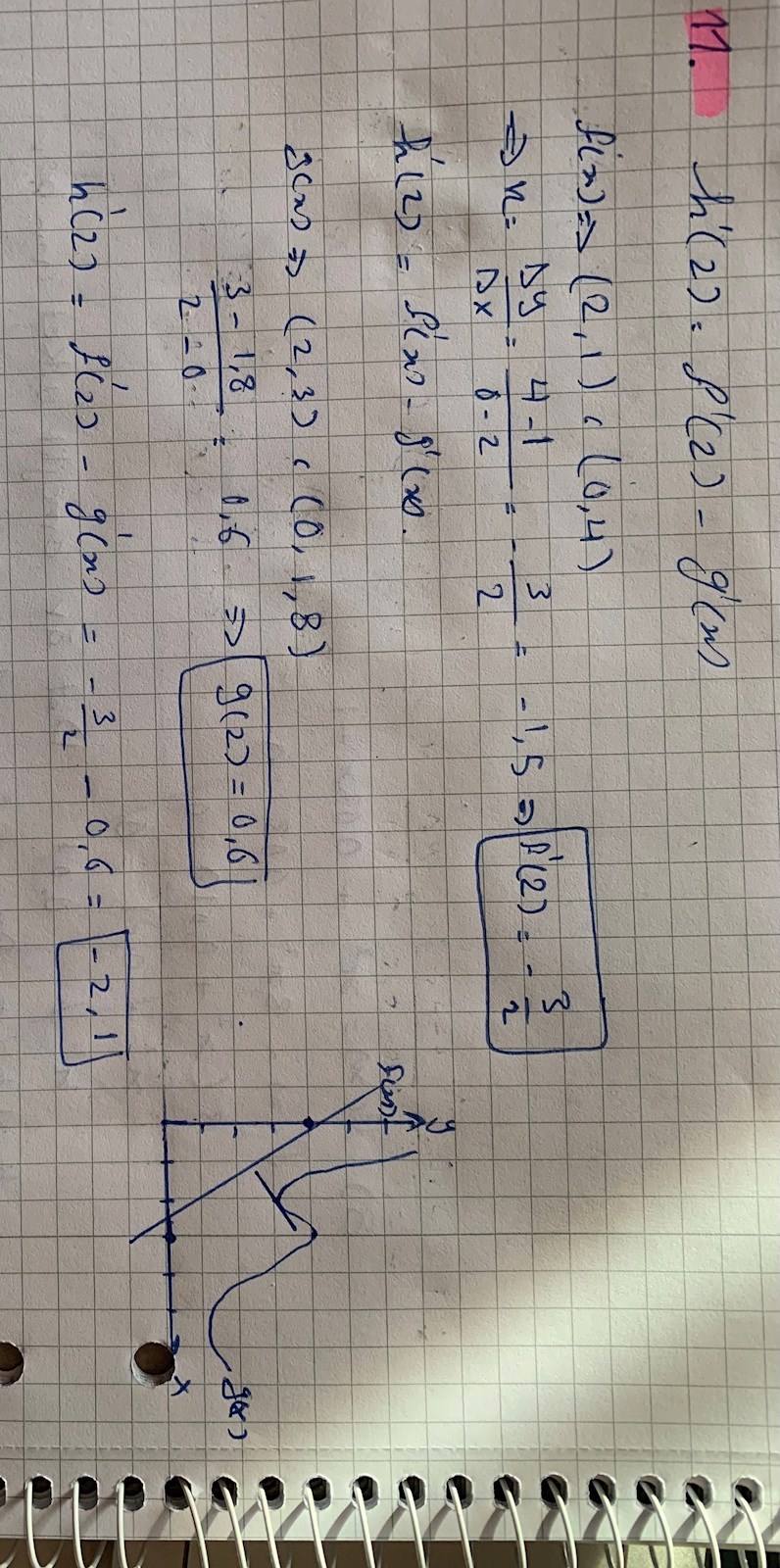 Eftersom det är en uppgift där man ska bestämma lutningen genom att rita i en befintlig kurva är ditt svar rimligen tillräckligt rätt, Men det är svårt att förstå hur du får fram g'(2). Här krävs en tydligare redovisning, t.ex genom att du ritar in tangenten och de punkter du använt för att bestämma lutningen i din ritning. Så man kan följa din tankegång. I din redovisning blandar du g(2) med g'(2) så jag blir helt förvirrad.