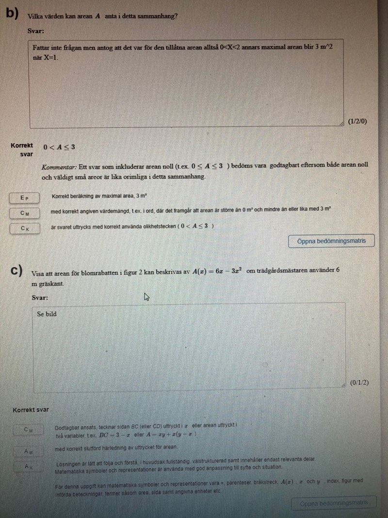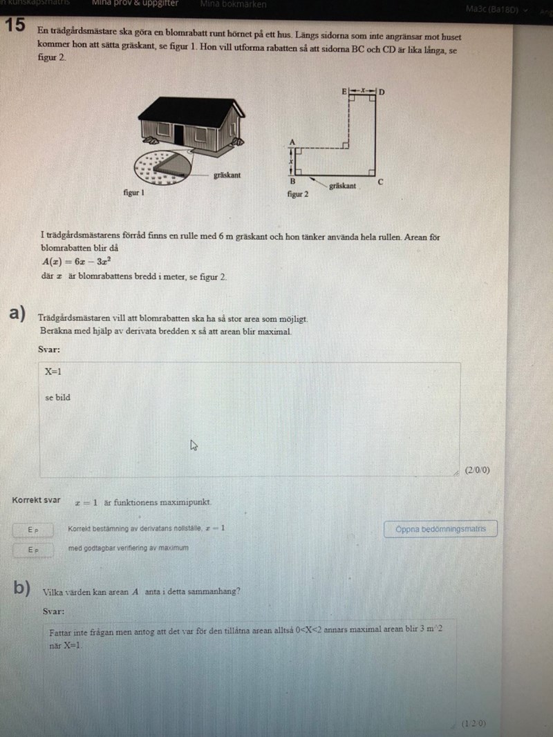 Dela området i 2 delar och där bredden är x och sidan är 3-x kan du beräkna. Hur beräknar man arean av en rektangel? Jo, (längden)(bredden) vilket är: x(3-x) som blir 3x - x^2. Ser du för vilket område arean gäller? Nu ska vi beräkna arean för det resterande området. Där är bredden fortfarande x men längden är inte 3-x längre... Ser du att vi måste dra bort ett till x för att få fram längden på det område vi försöker beräkna nu? Vi får alltså arean för område2 till: x(3-x-x) = x(3-2x) = 3x - 2x^2. Nu ska du bara addera area1 och area2 och då får vi: 3x - x^2 + 3x - 2x^2 = 6x - 3x^2.