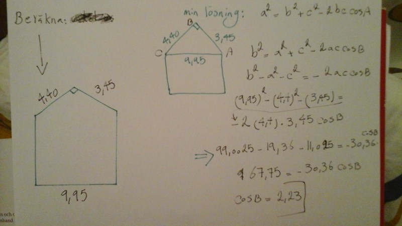 I så fall har du gjort alla beräkningar rätt, men som Lirim.K. säger så har du fått ett orimligt resultat. cos(B) kan aldrig vara större än 1!