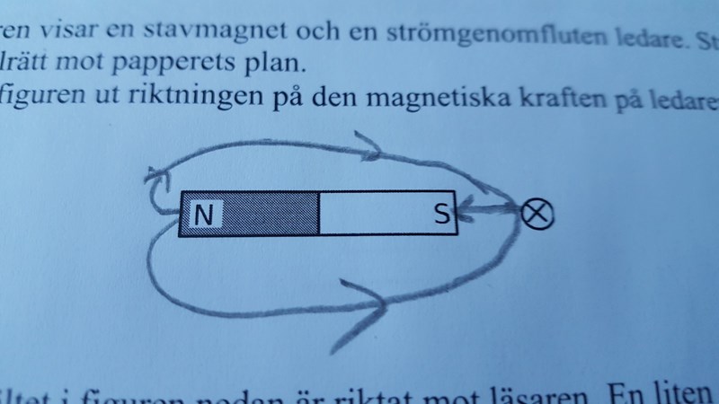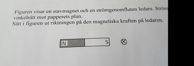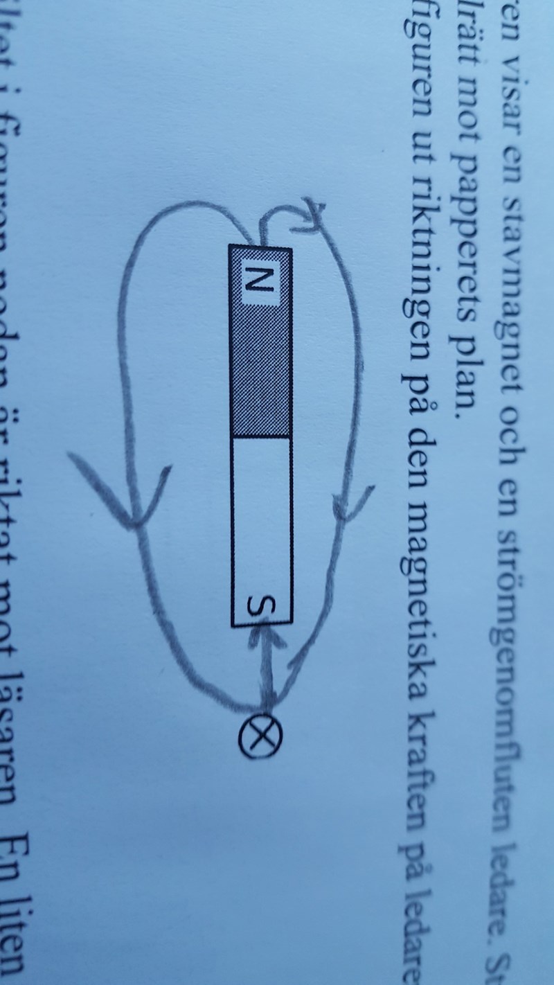 Då har du magnetfältets riktning vid ledaren, samt stömmens riktning i ledaren. Kraftens riktning ges av högerhandsregeln.