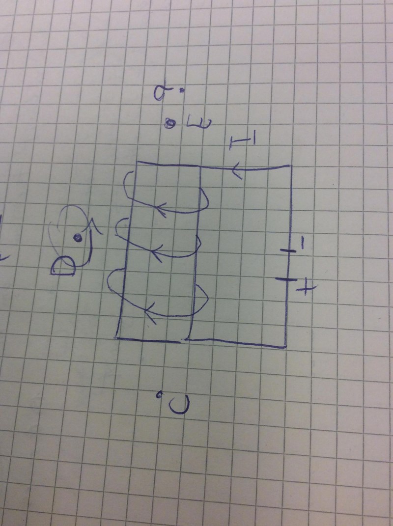 Rita nu in magnetfältet i din bild. Lägg gärna bilden på rätt håll också. Eller menar du att cirkeln kring D är magnetfältet? I så fall är det fel.
