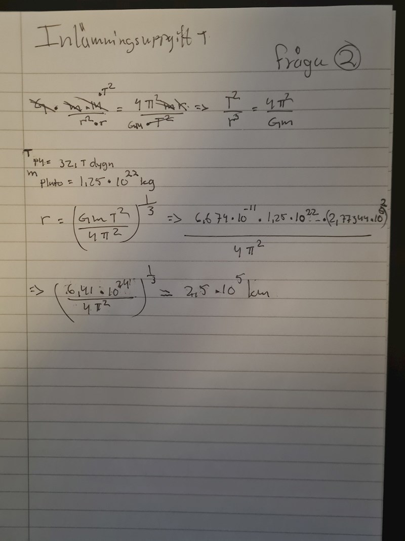 Frågan lyder: Sommaren 2011 upptäckte Hubbleteleskopet en ny måne runt Pluto som fick namnet S/2011P1. Det var den fjärde månen som upptäcktes runt Pluto så ofta kallas den P4. P4 har en omloppstid på 32,1 dygn. Hur långt från Pluto går dess bana? Pluto har massan 1,25·1022 kg.