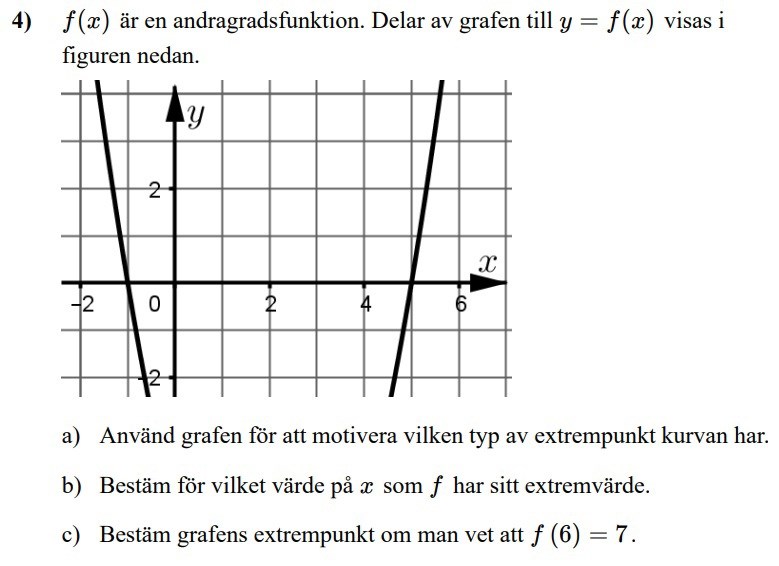 Nu vet du även funktionens nollställen: x=-1 och x=5