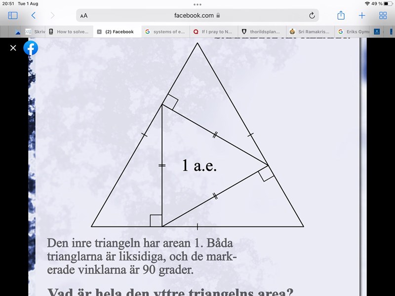 Ja, jag kan utnyttja faktumet att det är en likbent triangel. Jag kallar vinklarna för a och sidorna för x. Sedan kan jag väl använda likformighet ?