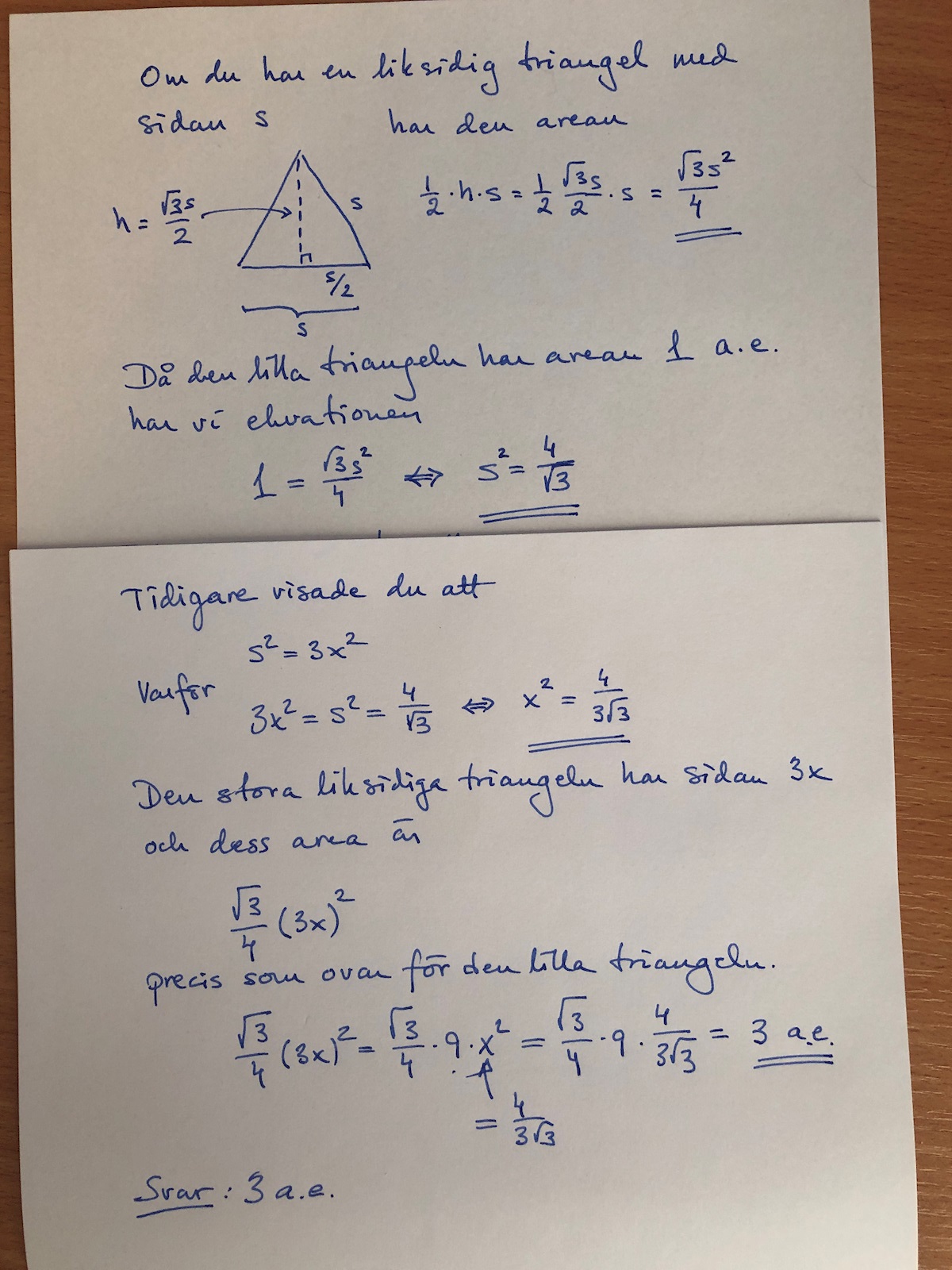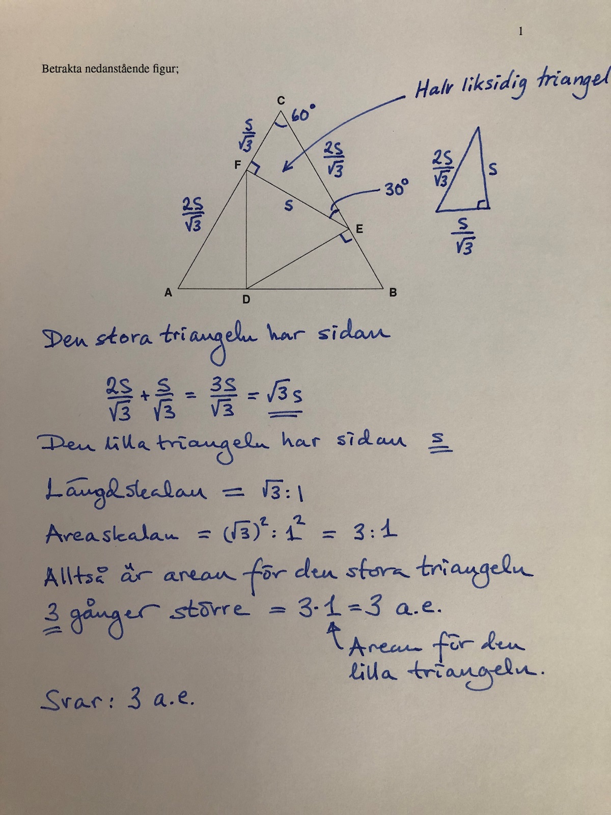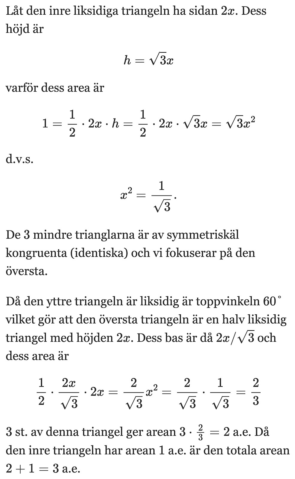 alltså 3 : 9 = 1 : 3. Den stora triangeln har 3 gånger så stor area som den lilla.