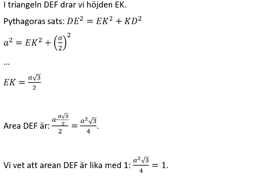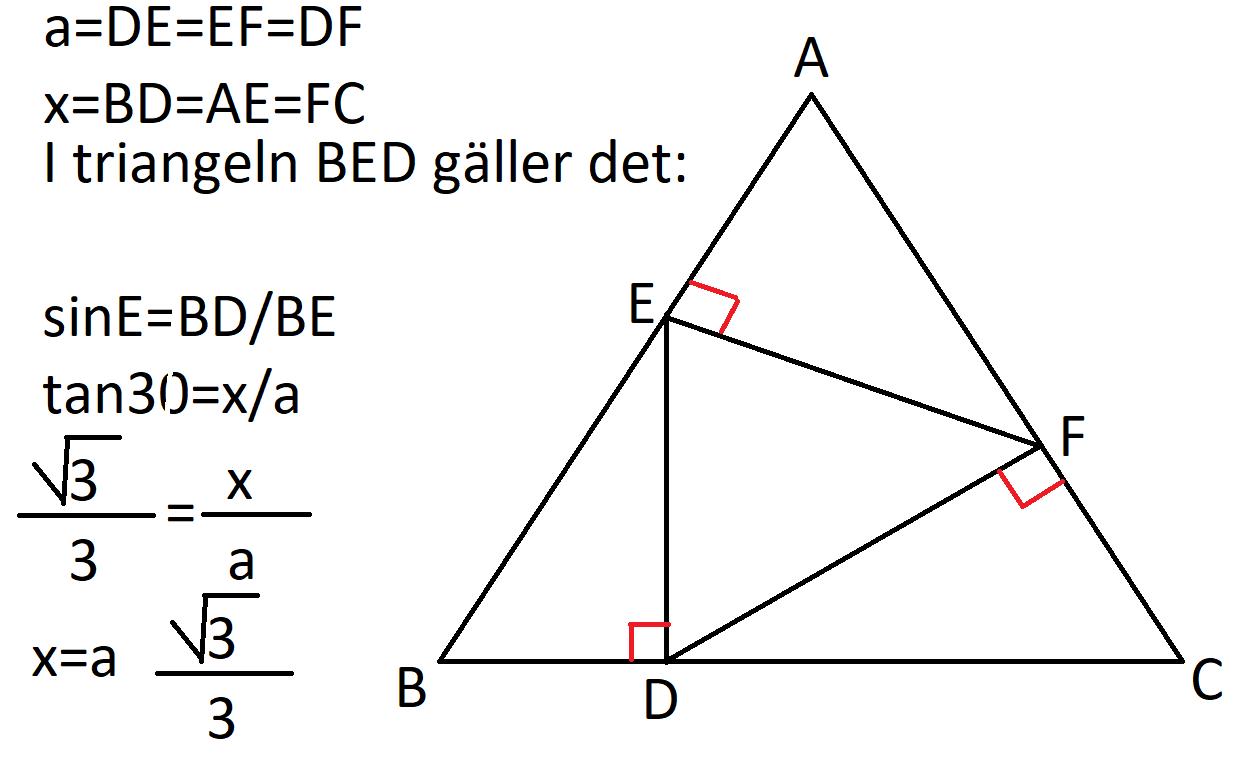 Om man sätter den längsta sidan i den rätvinkliga triangeln till 2x och den kortaste till x får man fram några ganska trevliga samband...