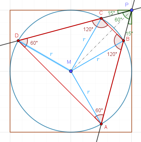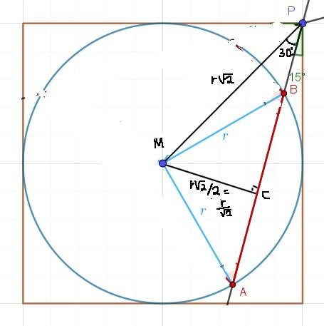 Fokusera nu på triangeln PMB: MB har längden r, MP har längden sqrt(2)r, vinkeln MPB är 30°. Enligt sinussatsen är vinkeln PBM 135°. Triangelns vinkelsumma är 180°, så vinkeln BMP är 15°.