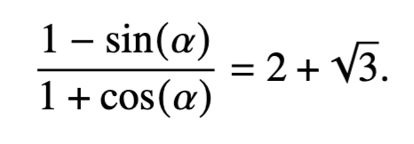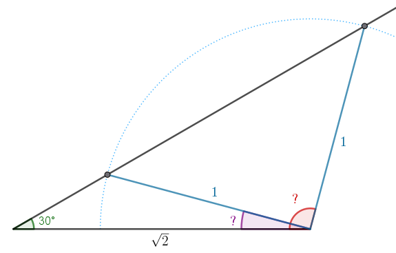 (högerledet är tan(75)) vilken har lösningen alpha=30 och så är man klar (nästan...) då resterande vinkel är 15° vilket ger 30° + Thales sats.