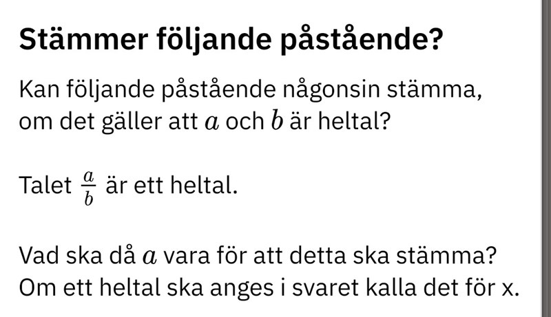 Om a/b ska bli ett heltal måste man ju veta både a och b? Jag vet inte riktigt hur jag ska tänka