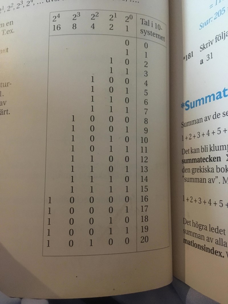 Jag ska ta kort på tabellen som jag har på matte c bok. Binära tal systemet har jag matte c bok. Det finns inte i matte A eller B. Binära tal systemet gick jag snabbt förbi och minns inte den så väl. Ska visa tabellen från matte C bok. Den här tabellen finns inte i boken Exponent.