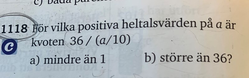 Då blir det väl att jag först testar vad 36/(1/10) är, vilket blir 360, alltså större än 36. Så a= Siffror under 10 Blir mer än 36. Och jag vet att 35/(360/10) är 1, alltså måste det vara högre än 360 för att det ska vara mindre än 36