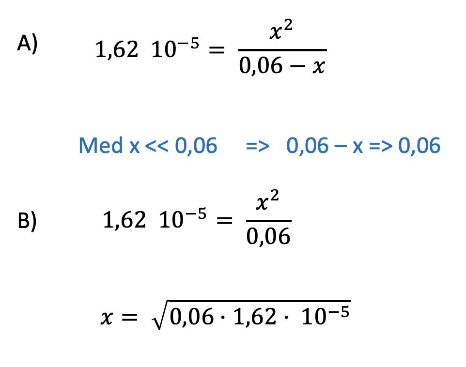 Smaragdalena skrev:Det blir en andragradsekvation,det stämmer,men man brukar kunna försumma x jämfört med ättiksyrans koncentration, så man behöver inte använda pq-formeln.