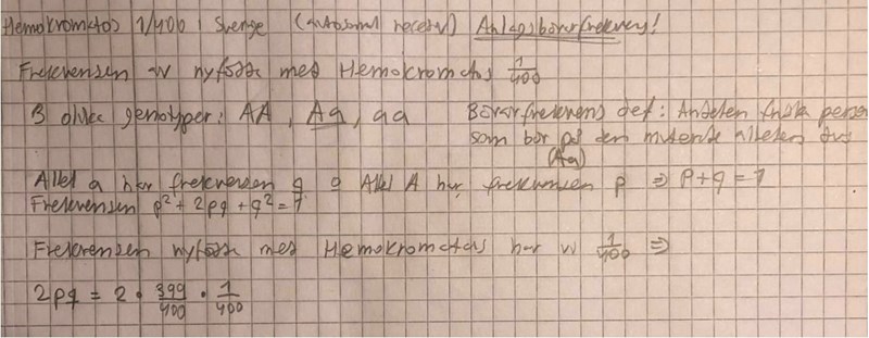 mag1 skrev:Du har redan börjat använda Hardy Weinbergs lag, som är rätt i detta sammanhang. Men du har endast ett känt värde och söker den "ungefärliga anlagsbärarfrekevensen" - så frekvensen för de specifika anlagen (AA, Aa, aa) behöver du inte betäkna, och det går inte heller med två okända parametrar.