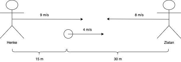 Tänk dig att Henke är längst åt vänster, bollen är 15 m åt höger och Zlatan är ytterligare 30 m åt höger, d v s 45 m till höger om Henke. Henke rör sig åt höger med hastigheten 9 m/s, bollen åt höger med hastigheten 4 m/s och Zlatan åt vänster med hastigheten 8 m/s.