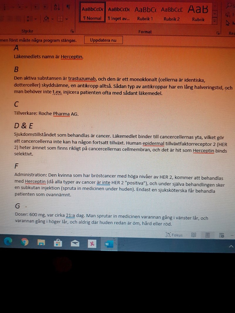 Jag blev fast på en uppgift när jag skulle beskriva läkemedlet Herceptin. Den aktiva substansen är Trastuzumab, och det finns mycket information om denna på fass.se: (och på andra sidor också förstås)