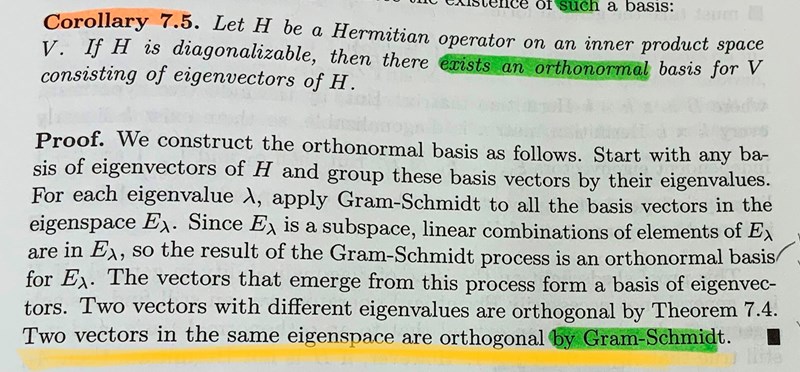 Bokens bevis bygger på att applicera Gram-Schmidt på egenvektorer med samma egenvärden.