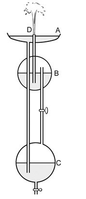 Man kastar en slant i behållaren A. Då sprutar fontänen vatten i D (D ligger över vattenytan).