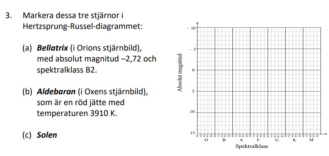 Det verkar finnas ett direkt samband nellan spektralklassen och temperaturen. Du får slå upp det. Man måste väl slå upp Aldebarans absoluta magnitud också, eller så är det meningen att du ska placera den enligt var röda jättar brukar vara i diagrammet.