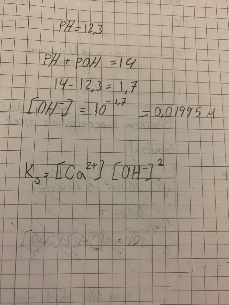 Hej! Uppgiften är : ”en uppslamning av kalciumhydroxid Ca(OH)2, i vatten visade sig ha pH värdet 12,3. Beräkna löslighetsprodukten för kalciumhydroxid.”