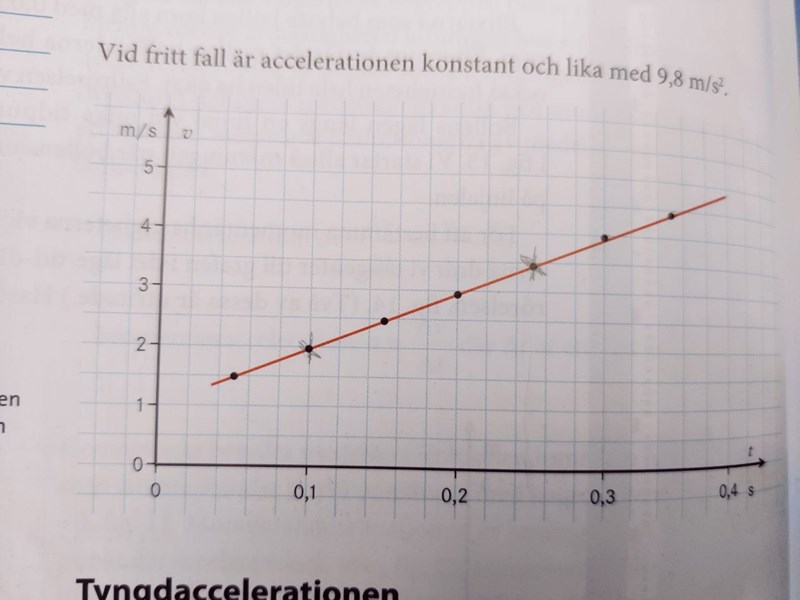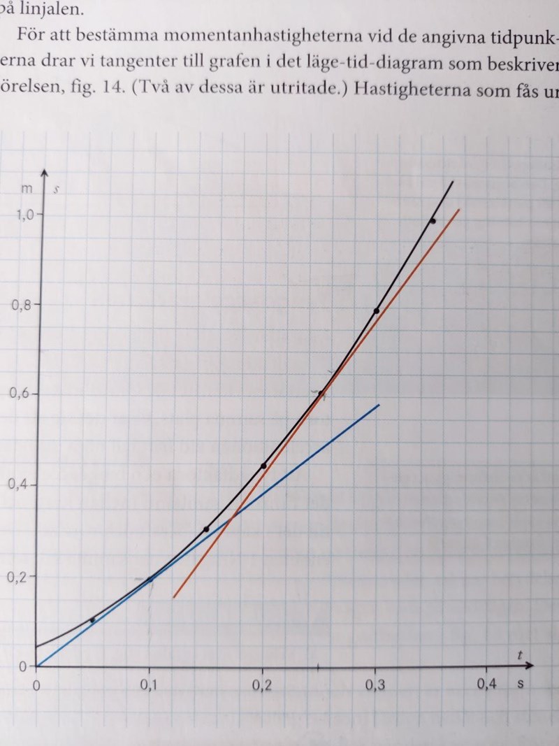 Hej förstår inte riktigt vad jag skall göra här. Har plockat ut punkterna 0,60 m/s 0,25 s för den röda tangenten och 0,2 m/s och 0,1 s för den blåa tangenten. Hur går jag vidare sedan? Svaret skall bli Punkterna (0,10s; 1,95 m/s) och (0,25 s; 3,43 m/s)