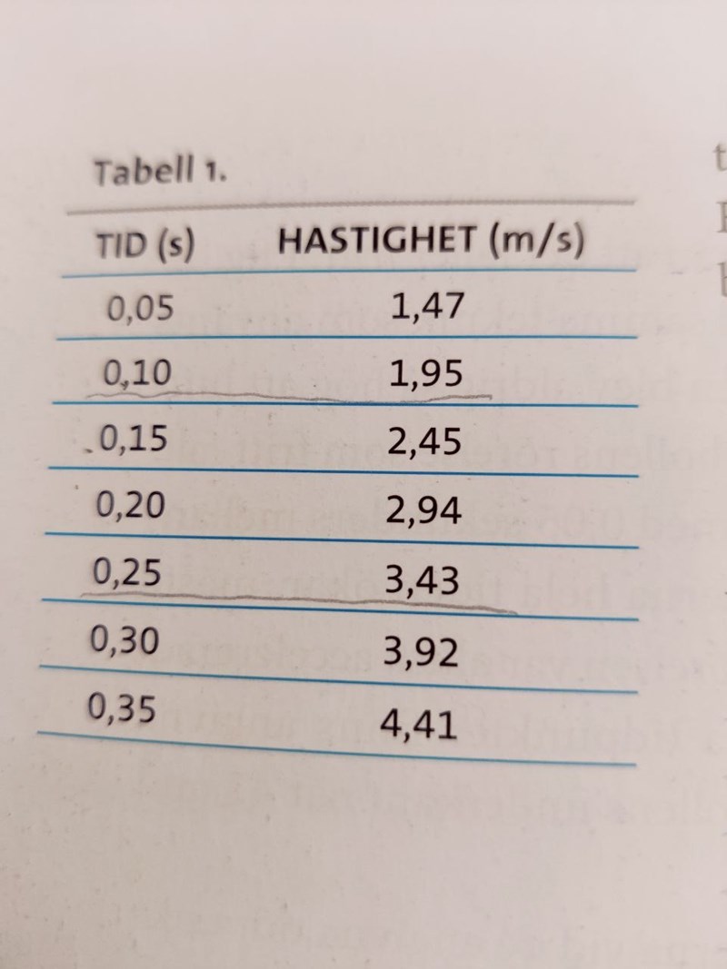 Blå tangent två punkter: 0,50 m/s - 0,15 m/s= 0,35 m/s och 2,6 m/s - 0,08 t/s = 2,52 t/s