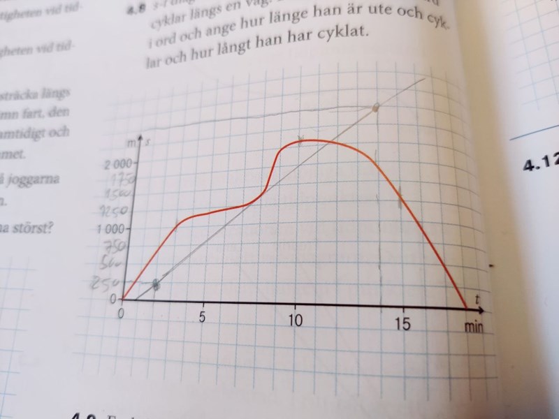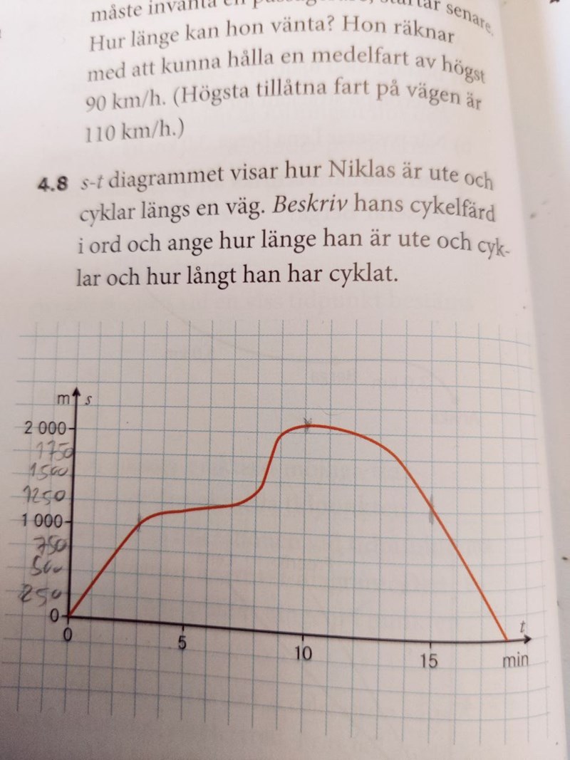 Hej har suttit med den här ett tag men lyckas inte få rätt på på medelhastigheten när Niklas ökar farten igen efter en trolig backe. Räknade ut de andra så här Vid start till 3 minuter cyklar han 1000 meter. 3*60 = 180 sekunder