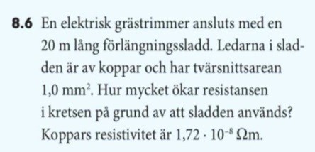 Jag förstår inte hur de får det till att förlängningssladden är 40 m lång totalt? Enligt svaret ska det bli 0,69Ω, men jag får detta svar enligt lösningen: