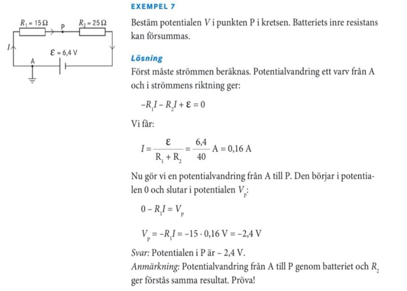 Undrar varför jag får fel svar när jag räknar ut strömmen till 0,426A genom formeln I = U/R, där U här är ℇ. De verkar däremot ha skrivit det som I = ℇ/(R₁ + R₂) och jag vet inte varför man gör så. Borde inte strömmen vara lika stor genom hela kretsen på grund av Kirchoffs första lag? ”Summan av strömmarna in mot en förgreningspunkt är lika med summan av strömmarna ut från punkten.”