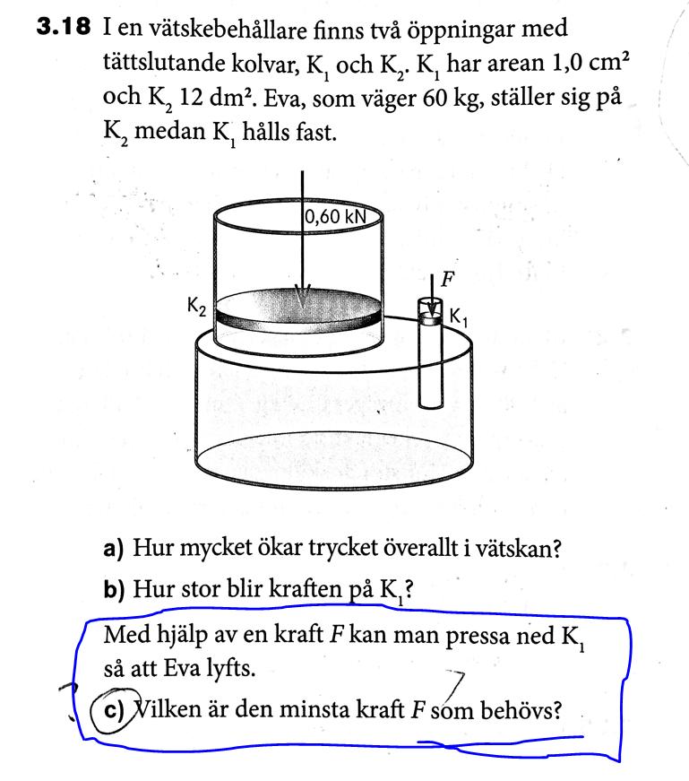 Har du ritat ut de krafter som verkar på kolvarna K1 och K2 när det är jämvikt? En del av krafterna finns med i bilden du har lagt upp, men inte alla.