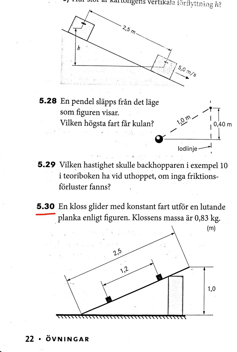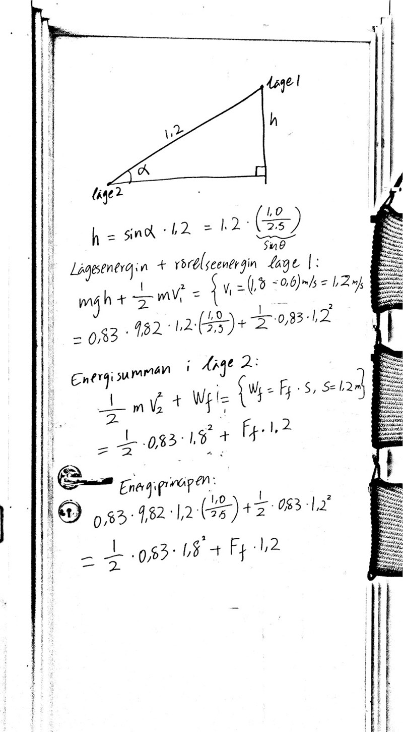Ser du nu att tyngdkraftens komposant längs plankan är motstående katet till vinkeln , så att den blir ?