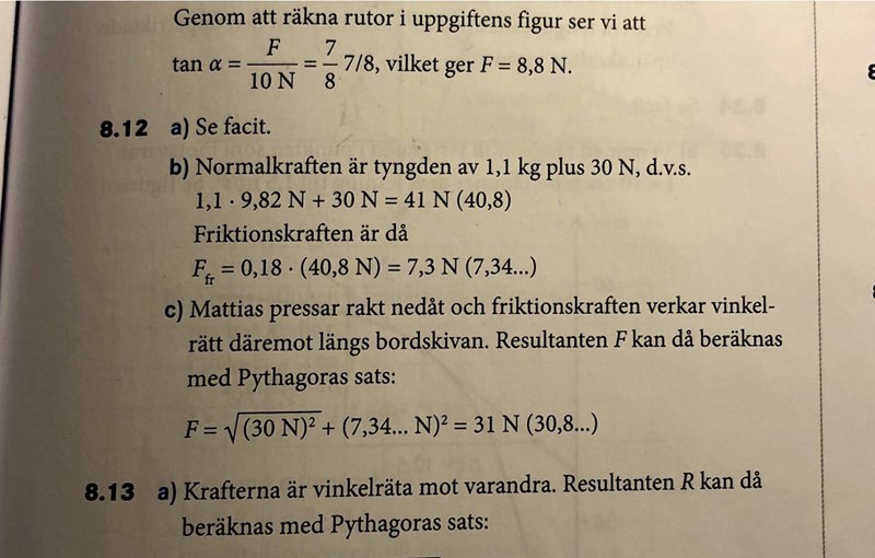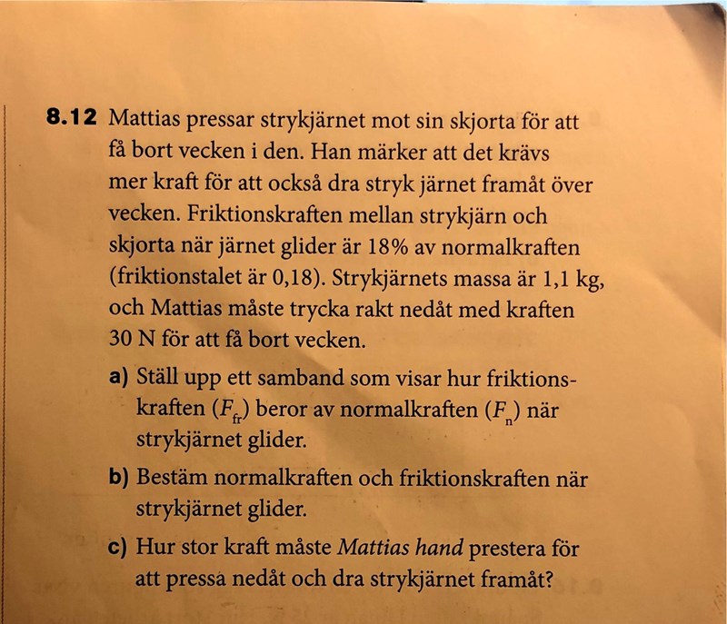 Den resultant kraften som Mattias hand presterar är summan av den kraften hand trycka rakt nedåt och den friktionskraften som han måste övervinna för att kunna dra strykjärnet framåt.
