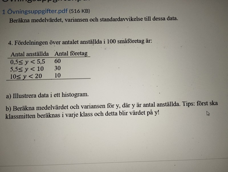 Jag skulle behöva hjälp med den här. Jag har gjort a) men osäker på om den är rätt. Jag har ritat ett histogram (ser dock att jag glömde skriva in antal anställda resp. antal företag). På b) förstår jag inte hur jag ska räkna medelvärde. Ska man räkna med hela anställda eller halva eller det kan ju finnas typ oändligt mellan dessa värden...